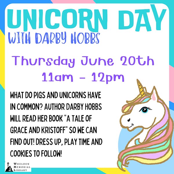 What do Pigs and Unicorns have in common? Author Darby Hobbs will read her book A Tale of Grace and Kristoff so we can find out! Dress up, play time, and cookies to follow!